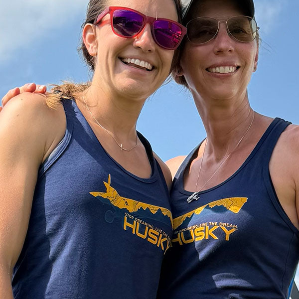 Side seamed. Racerback. Relaxed fit. Tear away label. Navy with a blue and yellow Husky night time graphic.